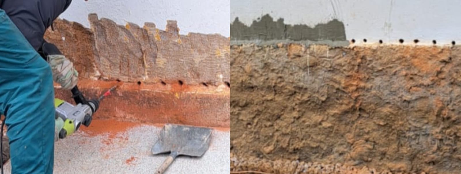 Injektovanou plochu, zbavíme odpadávající nesoudržné omítky jeli to potřeba. Dále vyvrtáme injektážní otvory, které jsou rozmístěny po celé délce sanované konstrukce v osové vzdálenosti 100 mm (Ø 14 mm).